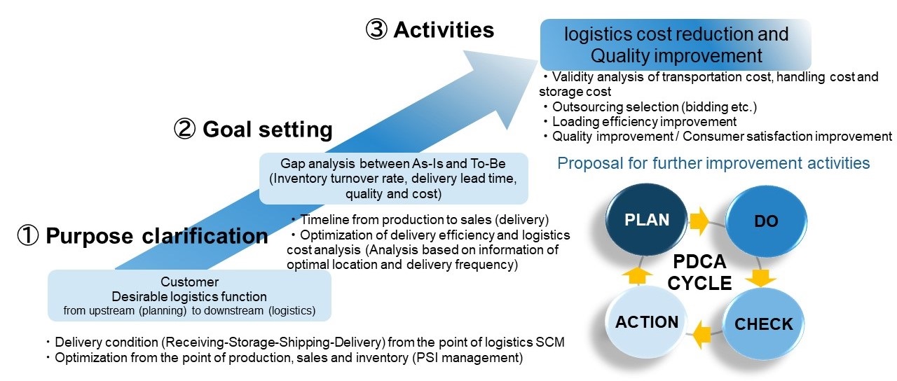 We manage the specialized project and develop various activities such as planning, operation and further improvement so as to meet the demands of customers. In addition, we expand the range of activities not limited logistics in cooperation with a consulting company.