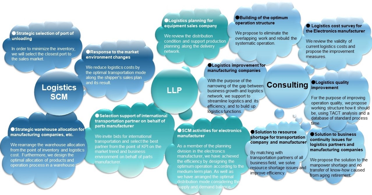 As logistics environment has changed and diversified significantly in recent years, not only logistics management but also high level services have been required. From the point of view of logistics (3PL/4PL) , we handle logistics SCM(LLP) on behalf of our client companies and aim to improve customer’s satisfaction and performance further.