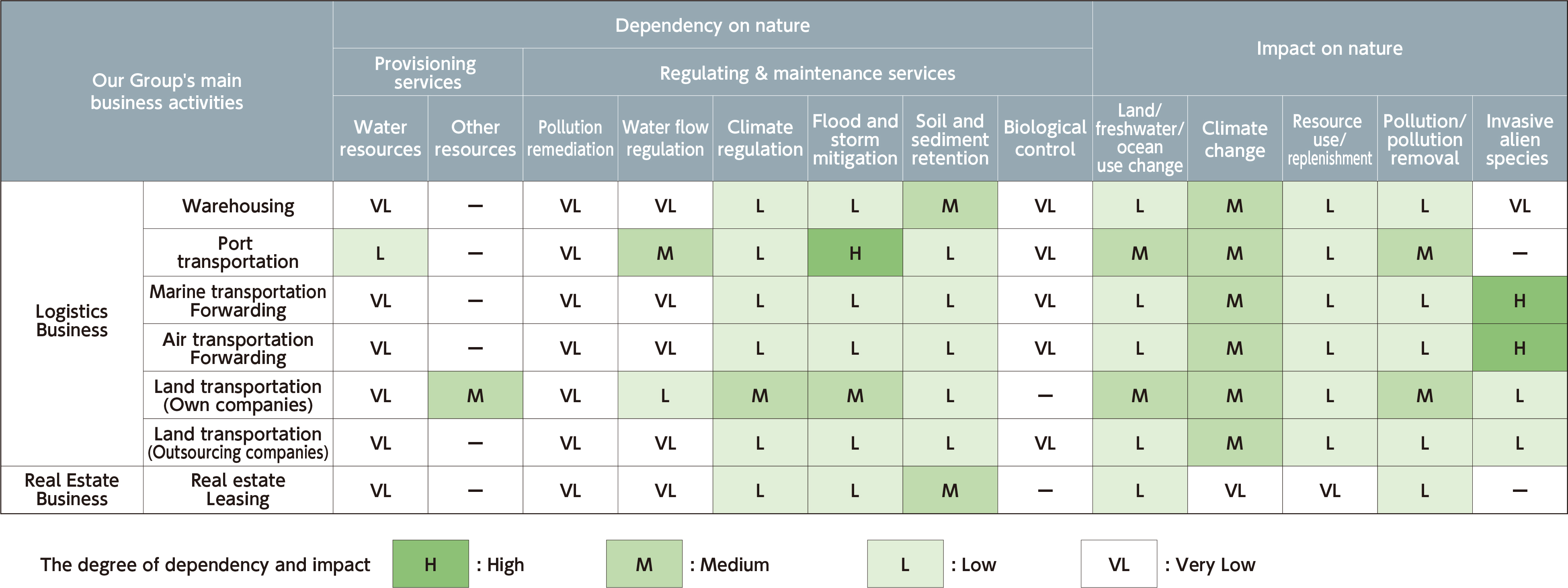 While our logistics-related business activities generally exhibit low dependence on nature, certain operations in transportation and real estate construction are susceptible to risks from floods, storms, and landslides. It has been confirmed that these activities significantly rely on flood and storm mitigation (flood control functions) and soil and sediment retention (soil retention functions).