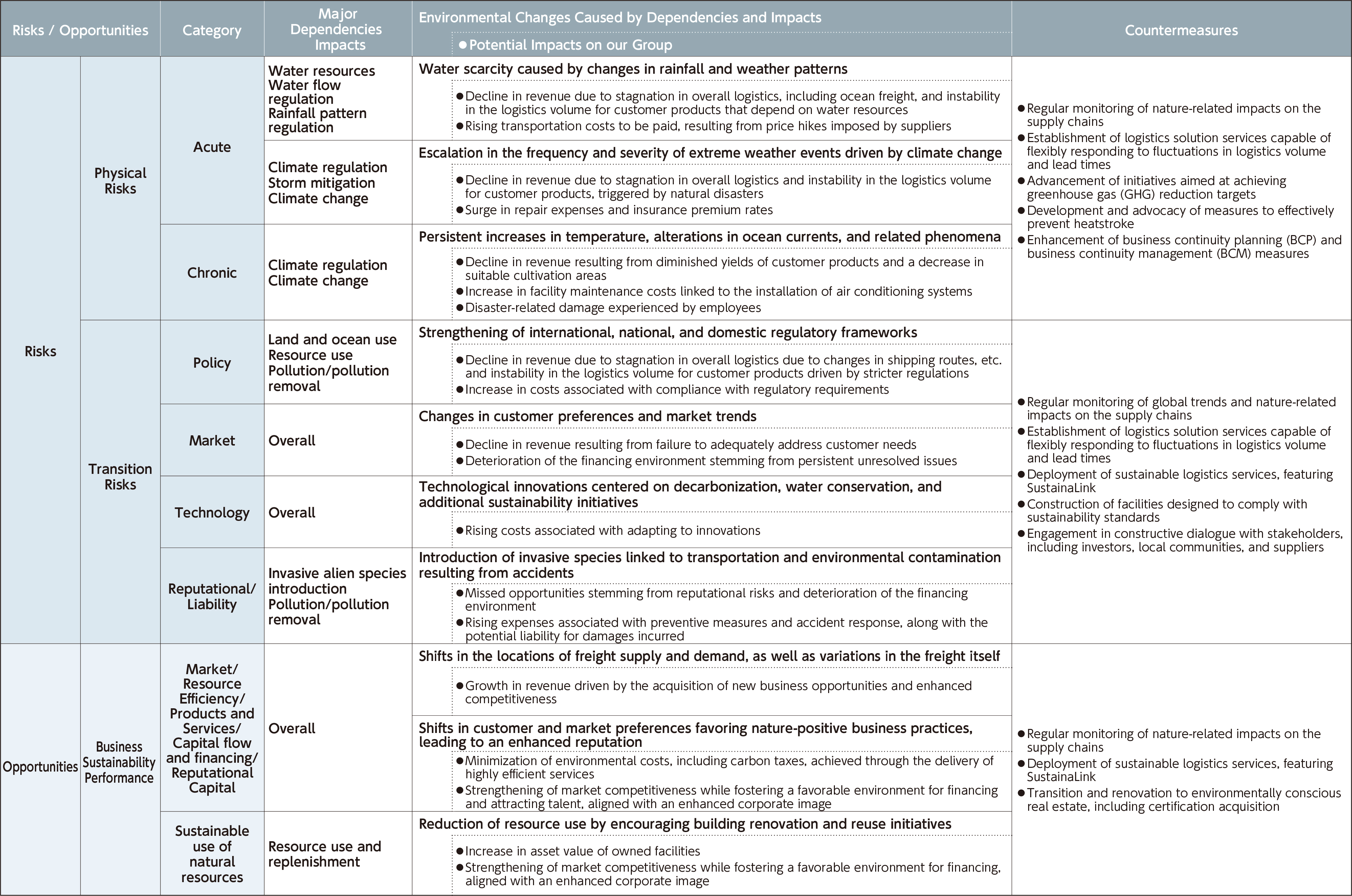 | We thoroughly analyze, assess, and identify the dependencies, impacts, risks, and opportunities linked to the Group’s logistics and real estate businesses. This includes a comprehensive examination of both upstream and downstream value chains, as well as the identification of priority locations for our direct operations. |