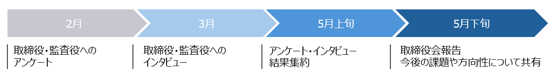 中長期的な企業価値向上に向けて取締役会の機能充実化を図るため、毎年、実効性評価を実施しています。取締役および監査役に対してアンケートおよびインタビューによる取締役会の評価を行い、それらの結果について取締役会で議論しています。